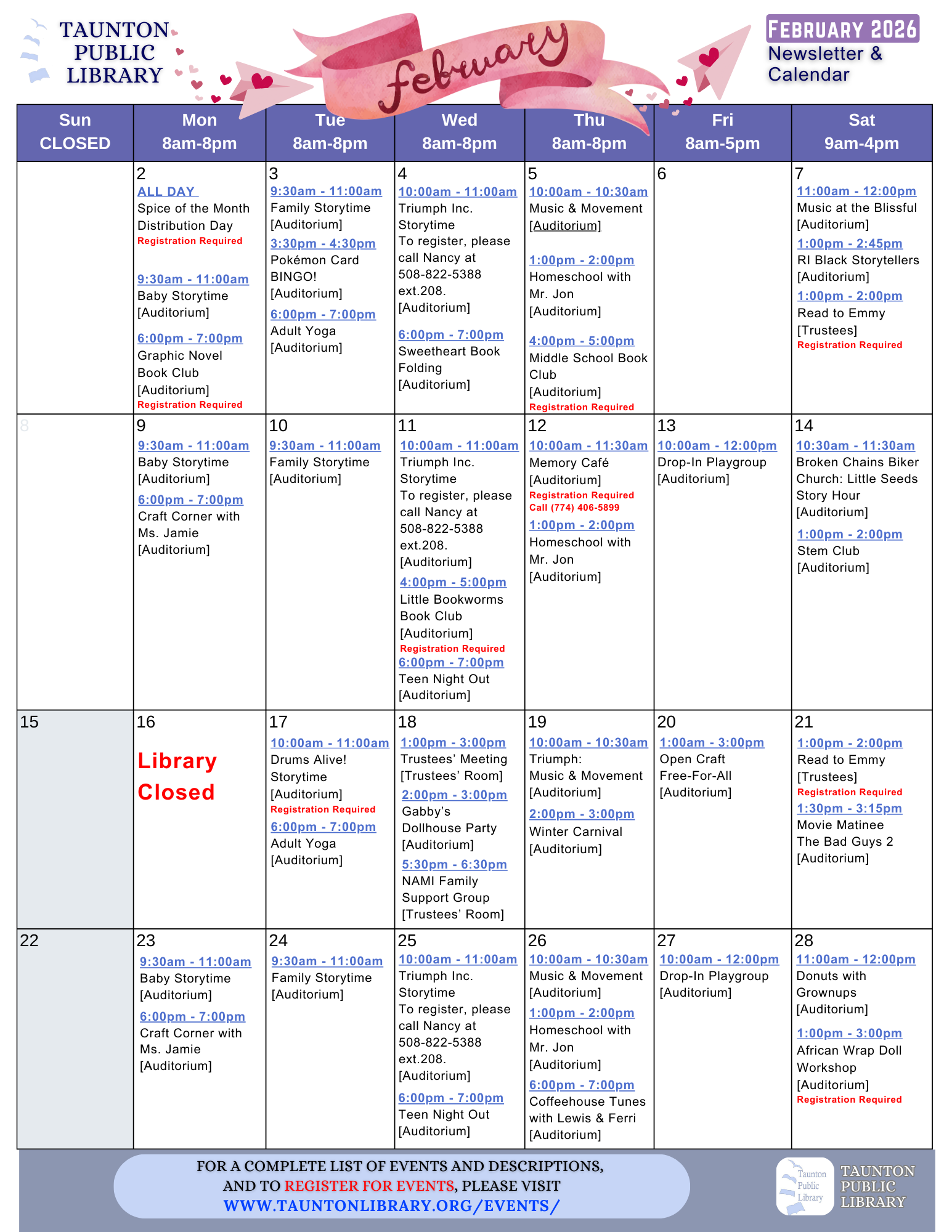 We offer storytimes, playgroups, book clubs,